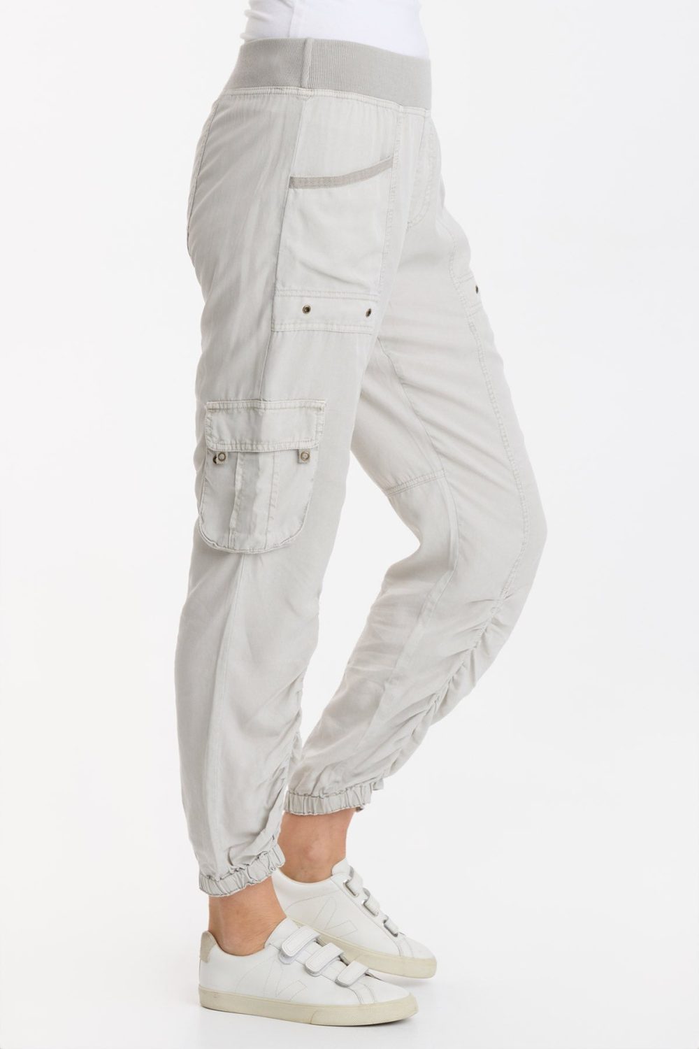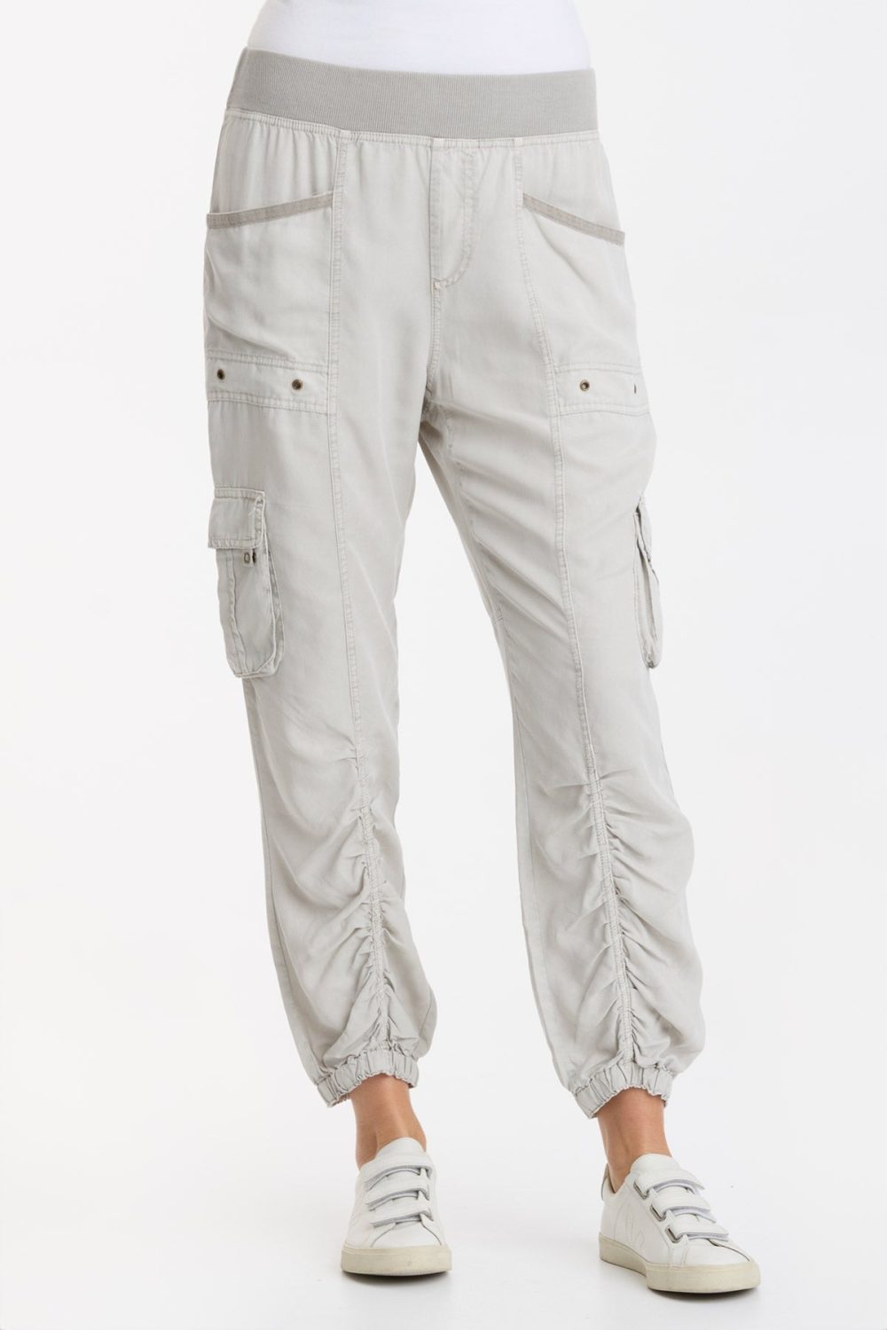 Flattering seaming and ruching at the front leg brings plenty of curve-conforming detail to this soft twill, banded leg pant. A contrast rib pull-on elastic waistband and cargo pockets with twill tape and antique brass hardware details finish off this style.